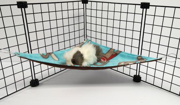 A Happy Hammock is a reversible, hand crafted hammock made of two layers of premium fleece. One side is a delightful print and the other is a contrasting solid color fleece. This luxurious hammock will provide a relaxing spot for your guinea pig to nap on throughout the day. He/she will enjoy resting on or hiding under this comfy and attractive addition to your cage. You can adjust the height of the hammock to accommodate your piggy so that he/she doesn’t have to work too hard to hop into tranquility.
